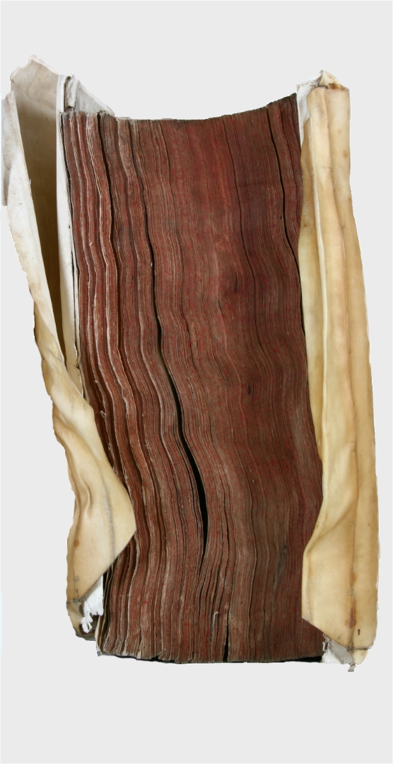 Stosskanten am Vorderschnitt eines Pergamentbandes, deformiert durch Löschwasser